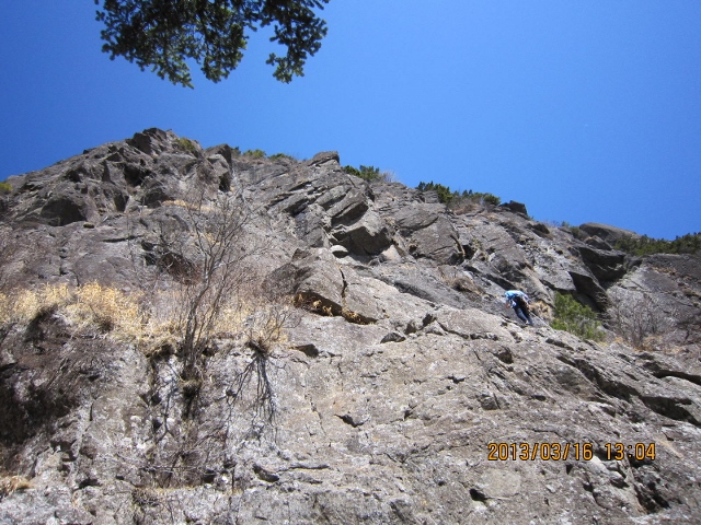 大月集合8:57。目の前に岩殿山は見える。橋を渡り、すぐ右折。これがまちがいで橋まで戻る9:30。車道を渡ってから右折。10分で登山口につく。紅梅と、急勾配が待っていた。ややあえぎで、寺のある小公園につく。ここの(?)高さは、東京スカイツリーと同じだそうな。石の階段が続く。つつじ、八重の桜。眼下には大月の街並みが望め、交通音がすぐ近くに聞こえる。10:20に、下りに取る道を左に分け、やがて山頂エリアに到着。馬場跡という表示がある。634m。昔は馬まで根性があったのだ。富士がぼんやりと美しい。岩殿城本丸跡10:32〜45。分岐まで戻る。岩にロープが出てきて、やがてヒエーッの鎖直登が現れる。渋滞で時間がかかる。ほっとしていると、また。岩場手前で、反対方向から下ってくる14人パーティーを待つ。順にすれ違うお嬢さんたちは、みな顔面蒼白。次はわれらの登りになり、納得した。よくこれを下ったものだと。結局1時間かかった。天神への尾根になると、雄々しく育ったアセビが続き、三葉つつじも見える。天神山で昼食、緑のそよ風、いい陽だな、12:20〜45。稚児落としを通過し、13:30林道に出る。花咲山を右に確認し、大月駅着14:07。まったりと反省後、15:48の電車で帰る。