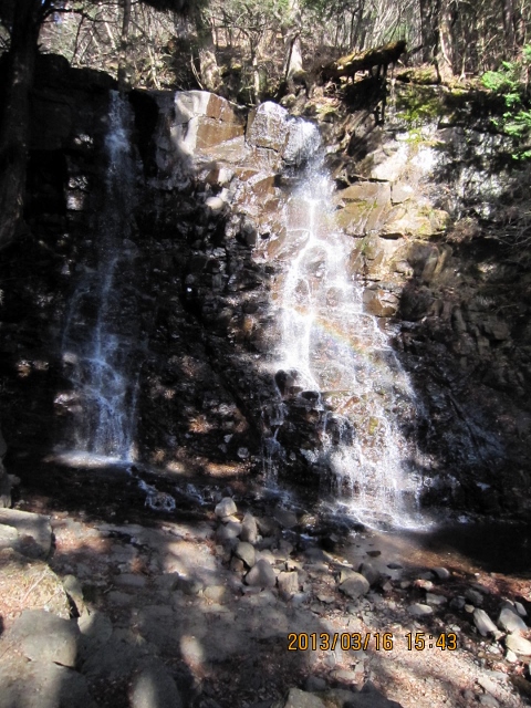 高尾発7:46の河口湖直通で三つ峠駅下車9:08。トイレタイム後ダルマ石まで1時間の車道歩き。気温も上がりなかなかのアルバイトだ。ダルマ石から道は急だがよく歩かれた山道に入る。40分程歩くとポッカリと目の前が開け富士山の雄大な姿が目に飛び込んでくる。ここは幹が二つに分かれた木の間から富士山を見る「股のぞき」と呼ばれる所。富士山を堪能後、更に急登をこなし石仏の並んだ八十八大師に到着12:08.昼食休憩。道は緩やかになり山肌を巻くように歩く。クライマーの取り付く屏風岩の下を回り込み、急な階段を上って三つ峠山頂到着13:22.山頂は目の前の富士山はもとより360度の大パノラマが広がる。写真・山座同定を楽しんで下山。頂上直下からは残雪があり、程なく結構な量で凍っている箇所で軽アイゼンを着けるが1分も歩かないうちに必要無くなってしまった。雪解けで緩んだ上に落ち葉が乗った滑りやすい道を行く。中々高度が落ちない緩い下りが続いたが、途中から母の白滝目指して急降下する。母の白滝は二段構えで水量もあり見応え十分。ドロドロの靴等を川で洗い、バス停まで車道を必死に歩く。ジャストタイムでバスに乗り河口湖駅まで行き皆で反省会をして帰る。