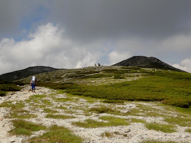 19日 晴れだった土曜の予報が悪化してきたが、曇で踏みとどまったので予定通り出発。郡山で東北新幹線から在来線に乗換え二本松へ。予約のタクシーで塩沢温泉まで入り(ジャンボ1台¥6,140)9:35に歩き始める。空は高曇りで安達太良の稜線は良く見えている。広葉樹林帯はまだ色付いていない。11:20、僧悟台中央の草原で2度目の休憩。少し色づいた木々の上に安達太良山、鉄山などが良く見えたが、笹平に登る途中からガスが出て視界が遮られるようになる。12:40主稜線の笹平。そこから箕輪山には30分程で到着。ガスで何も見えず、風が強くて寒いため、写真だけ撮って早々に下り始める。この下りが粘土質で滑り易く、1時間ほど苦しめられる。途中から小雨も。鬼面山に2:45。あとは道も歩き易くなって、3:45に新野地温泉の相模屋に到着。さっそく入浴を楽しみ、美味しい夕食で乾杯。