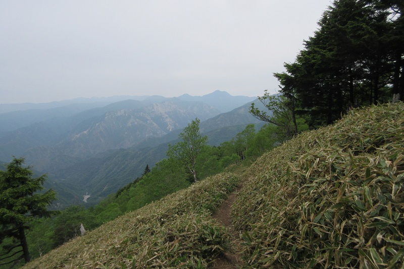 鶴ヶ鳥屋山山頂から、樹間に奥秩父の山なみ |