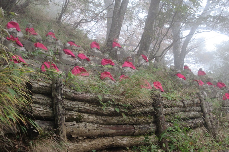 26日 6:35出発。小雲取越え入口の小和瀬橋まで車道を歩く。橋を渡り6:50民家脇の石段を上る。展望の開けた場所に東屋が建つ桜茶屋跡8:20着。上空は晴れているが霧がかかり展望なし。小さな標識のみの桜峠通過。杉林の中の石堂茶屋跡で小休止。皇太子殿下行啓碑を見るとすぐに林道へ出て、150m先にトイレありの標識がある。立派なバイオトイレが建っていて駐車スペースもある。林道を横切り山腹道を登ってゆくと小さなお地蔵さんが建つ百間ぐら。和歌山県夕陽百選に選ばれている眺望の良い場所だ。ここからは傾斜の緩い道が続き、伊勢路・万才峠への分岐を10:55通過。1時間程で集落に出て、12:13請川登山口着。請川バス停前の食事処で食事をして時間を潰し13:35のバスで本宮大社へ向かう。大斎原と本宮大社を参拝して15:10発のバスで川湯温泉へ。温泉で一泊し翌日帰京。