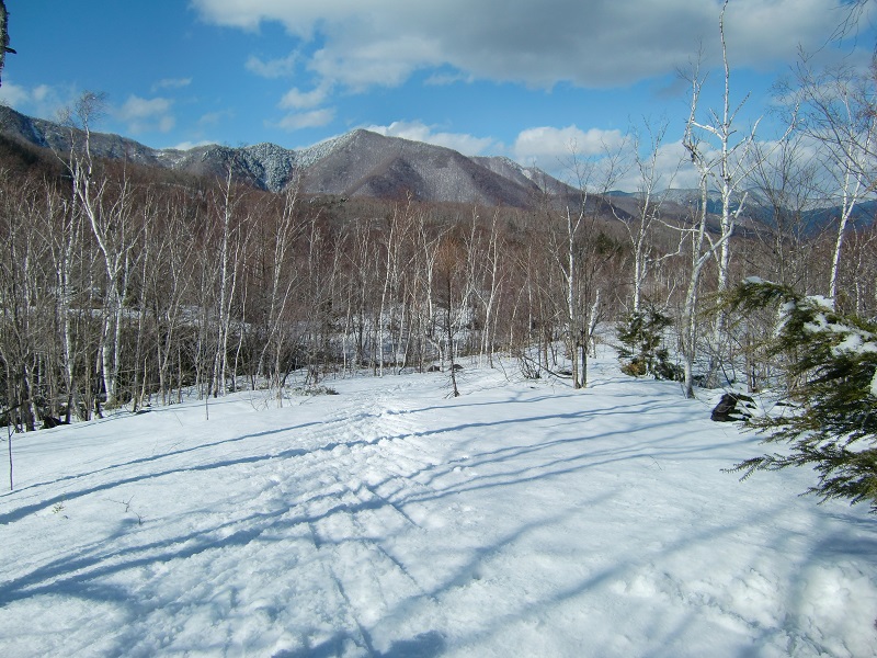 13日 天気は曇り。旅館の主人から今年は雪が例年の5分の1、ドカンと降ったのは2回位、こんなことは初めてだと聞く。9:00車で休暇村ゲレンデ前まで送ってもらい、リフトを一本乗って林道を20分程滑り乗鞍自然園へ。標高1600m、雪をかぶったシラビソやコメヅカの森はとても雰囲気がある。森をぬけ孫市平へでると白樺林と乗鞍岳がキレイだ。誰にも会わないので、不慣れなカメラのセルフタイマー機能と格闘して集合写真を撮る。牛留池で昼食にしようと向うが分からず、12:00休暇村近くでラーメンを作り昼食。昨夜眼鏡のフレームを(踏んで?)破損したKさんは、翌日の予定を考慮し一足先に帰京。3人で善五郎の滝入口まで歩き、板を置いて見に行く。一部氷が融け勢いよく流れ落ち迫力がある。休暇村裏手から冬季ツアーコースを一ノ瀬園地との分岐まで滑り14:45クロカン終了。宿で温泉入浴後反省会。16:21発のバスで帰る。
