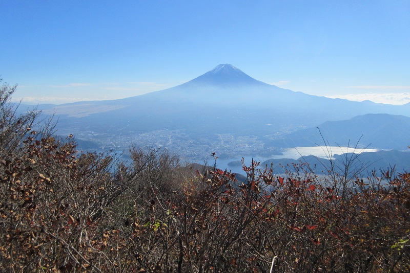 出発を高尾7:06発に変更。天気が良いためか電車は大混雑。大月で乗換え河口湖8:43着。8:57駅前からタクシーで釈迦ヶ岳登山口へ向かい、登山口の看板の所から林道に入る。狭いが簡易舗装されていたので行ける所まで行ってもらい9:20着(\5,860/台)。10分ほど歩くと駐車スペースの有る林道終点9:35着。色付いた落葉樹林の中を登り10:00稜線に出る。登るにつれ岩場が現れる。足元に注意しながら登ると展望が開け、雪が薄っすらついた南アルプスと八ヶ岳が見え、10:33山頂着。快晴で360°の大パノラマ。山頂は我々だけ、しばし眺望を楽しみ10:50下山開始。下り始めは急坂。府駒山を通過する辺りは紅葉が見頃。すずらん群生地分岐を過ぎ、11:45車道に出るとどんべい峠。車道を横切り少し登ったピークで昼休憩(11:57〜12:20)。上芦川の分岐を過ぎ、ブナ林の中を40分程登って黒岳山頂13:15着。山頂は素通り。展望台で富士山を眺めながら15分の休憩。山頂に戻って集合写真を撮り旧御坂峠へ下る。旧御坂峠14:23着。十字路になっている峠には廃屋となった御坂茶屋がある。最後の休憩を取り14:35三つ峠入口へ下る。道幅は広いが石がゴロゴロした所もあって歩きづらい。三つ峠入口バス停15:31着。15:53遅れて来たバスに乗り富士山駅16:13着。駅構内の店で反省会をし17:48発大月行きで帰途につく。