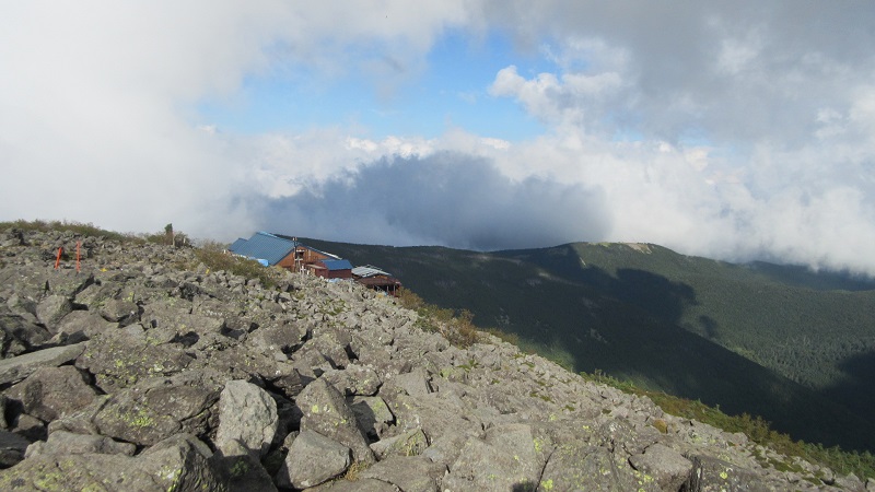 ガスが切れると眼下に小屋 |
