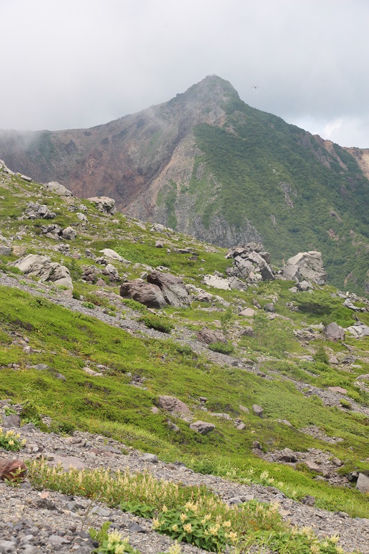 明けない梅雨、コロナウィルス感染拡大と悩ましい状況の中、梅雨前線の南下予報を見て実施を決めた。東京6:40発の「やまびこ」はガラガラ。那須塩原からのバスの客も少なめだったが、なぜか過半数がインド人(?)観光客だった。那須ロープウェイ山麓駅に9:15到着。予報に反して晴天で、青空に朝日岳がクッキリ。トイレを済ませて登り始める。樹林帯から出ると爽やかな風が来る。ウラジロタデが多く咲く山腹道を約1時間登って10:25峰の茶屋着。ハイカーの数はかなり多く、先ほどのインド人グループも。小休後茶臼岳への登りにかかる。青空が減りガスも下がって来始めたがまだ雨の気配はない。11:10茶臼岳山頂。ひっきりなしに登ってくる観光客に混じって昼食休憩。11:35下山開始。下山路は途中までロープウェイ山頂駅に向かう道。少し展望も楽しめる中、多くの観光登山者とすれ違いながら下る。12:00、この道と別れて牛首に向う捲き道に入ると格段に静かになり、牛首手前で殺生石への下り道に入って以降は一人の登山者にも会わなかった。この道はすぐ樹林帯に入り、最初のうちは岩がゴロゴロしていて歩きにくいが湧き水の小沢を過ぎた辺りから歩き易くなる。飯盛温泉跡、不動沢と順調に下るうち、霧が山を覆い始めポツンとくる。車道に出る手前で傘を出し小雨の中14:20車道に出る。ここから殺生石までは1qちょっととあったが、四方八方に道が分岐する別荘地の中でロスト。30分ぐらいロスしたが参加メンバーのGPSの助けを得て15:18無事那須湯本のバス停に下山できた。帰路のバスは大渋滞に巻き込まれて50分の行程に何と2時間以上を要した。コロナ回避でマイカー観光が増えたという事か。駅前の居酒屋で軽く反省会をして19:02の「なすの」で帰路。こちらはガラガラだった。梅雨のピンポイントの晴れ間にうまく出会えて幸運だった。