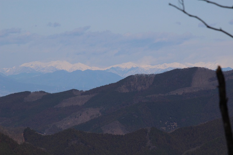 梁川駅に降り立ったのは我々の他に1パーテイのみ。彼らは倉岳山方面に向かったようだ。身支度を整え出発。快晴である。国道20号から桂川を渡り、塩瀬の集落に入る。浄水施設の脇より登山道が始まる。太い水道管パイプに沿って行き、徐々に高度を上げる。振り返ると滝子山の左奥に真っ白な山が見える。南アの一角であろう。扇山が大きい。沢沿いの道が終わり、やがてジグザグの急登が始まる。ロープにつかまりながら慎重に進む。雪でもついていたら難儀するだろう。道が水平になると寺下峠は近い。小休止後矢平山にむけての上りだ。短いが岩混じりの急登である。矢平山着12:30。昼食タイムにする。三等三角点のある静かな山頂であった。南側が開けていて西丹沢の山から道志山塊が眺められた。北面は白い。長い休憩を終え、これより四方津に向け下る。旧大地峠、新大地峠を過ぎると道は西へと向かう。昨年の台風のつめ跡であろう。ところどころ大木が根元から倒れているのが痛々しい。御座敷の松で小休止。越えてきた矢平山が谷を隔てて大きい。木々の間からは権現山、その背後に三頭山・生藤山・陣馬山の笹尾根が見渡せた。落ち葉を踏んで快適に下る。川合集落をぬけ、橋を渡って15分ほどで四方津駅に着いた。高尾駅で直帰組と反省会組に分かれ、山行を終えた。