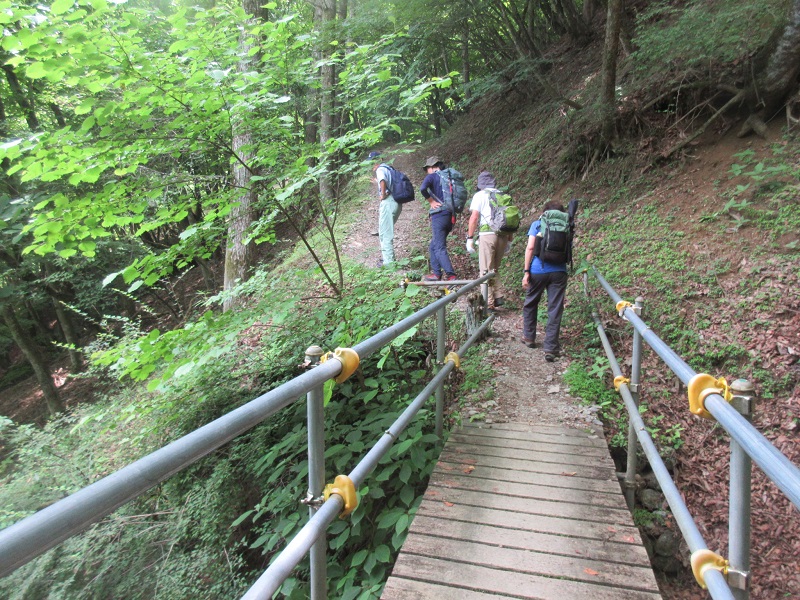 峰谷からの浅間尾根を歩くコースは舗道歩きが長いので、コースを変更して水根沢林道歩きに変更。8時発の奥多摩駅バス停から20分、水根バス停で下車。8:40スタート。水根沢キャンプ場を通り緩やかな水根沢沿いに歩く。いくつか木橋を渡り、11:50分岐で左方向は5分下がって20分の急登なので、緩やかな登り30分の右方向へ。ところが結構下ってから左折するので、時間はかかった。ようやく水根山のふもとに12:20。昼食タイムで休んでいると榧ノ木尾根から登ってきた登山者に、水根山へ直登する登山道を塞いでいると注意される。地図にはないが確かに道はあった。20分休憩後、鷹ノ巣山13:05登頂。南側の展望は素晴らしい。下山は水根山を通って、昼食をとった分岐へ。榧ノ木尾根を下る。途中榧ノ木山があるはずだが、迂回路を進んだので頂上は踏めなかった。リーダーの足が何度かつり、小休憩をとりながら倉戸山15:30。あと1時間歩いて倉戸口バス停に。15:51のバスで奥多摩駅へ。駅近の地ビールを飲んで帰路についた。歩行7時間、休憩1時間の長い歩きで、夏山へ備えいい運動になった。