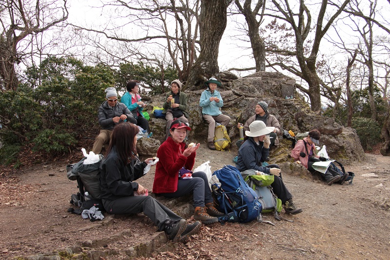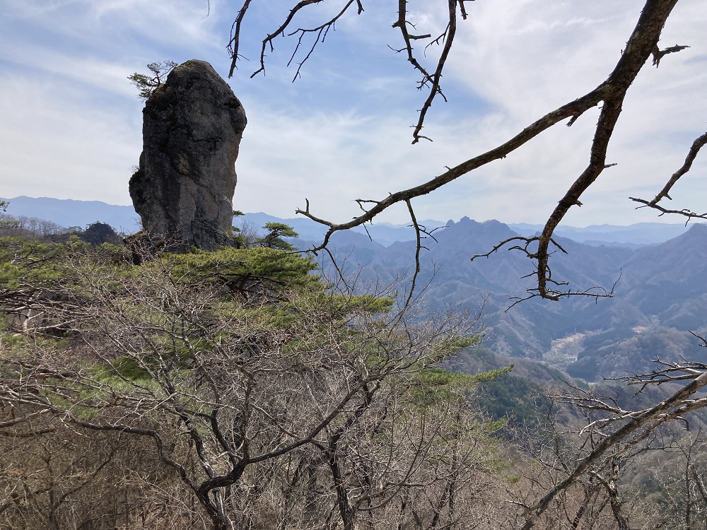 武蔵五日市駅で全員が揃い、藤倉行きのバスに乗り千足で下車。登山者は我々と3人の親子連れと単独行の女性。天気は高曇りで今日一日持ちそうだ。身支度を整え、天狗の滝の指道標に導かれ舗装路を行く。これがかなり急だ。山道に入り小天狗の滝を経て天狗の滝着9:45。水量は少ないが落差40mはあろうか、なかなか立派だ。見応えがある。ここから稜線(つづら岩)まで標高差350mの急登だ。ひたすら登るのみで腰をおろす場所もない。だが高度は一気に稼げる。つづら岩着11:10。小休止。5、6人の登山者が登降の訓練をしていた。これより尾根歩きである。樹々は新芽が出る前で周囲は明るい。だが、後一か月もすると新緑に覆われ遠くの景色は見えなくなるのである。鶴脚山着12:10。ここで昼食にする。薄日がさしてきて暖かい。食事を終え馬頭刈山へ向かう。行く手右に木々の間から上部は雲に覆われているが、富士の裾野が見えた。左に目をやると大岳山から御岳山が望まれた。馬頭刈山で写真を撮り、ここからは下るのみだ。高明山は焼失した神社の跡があった。昔はここまで登ってきたのであろう。あたりは檜林で薄暗い。下る途中、幾つか其々違った名前の祠が祀ってあった。地元の信者が担ぎ上げたのであろう。軍道分岐には崩落のため通行止めのテープが張ってあった。だらだらの道を下り車道を吊り橋で渡ると最後の登りである。大した登りではないのであるが、木の階段なので堪えた。長岳からは正面に戸倉三山の一つ、臼杵山が競りあがる。そして下ったところが瀬音の湯だ。丁度バスがきたので乗り込む。そのため五日市には予定より早く着いた。