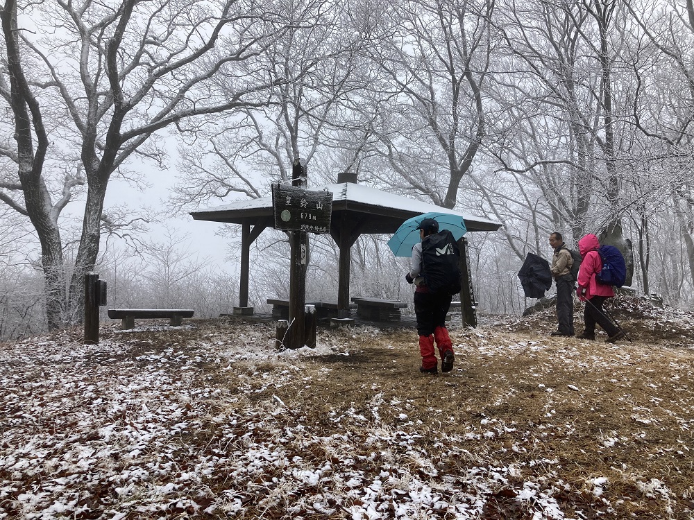 前々日から降っている雨は23日には止む、という予報なので予定どおり出発した。降車近くになりめいめいスパッツを装着する。小川町でバスに乗り換えるのであるが、まだ小雨が降っている。登山者は我々のみ。貸し切りだ。この天気で酔狂な人はいないようである。打出(手)で下車。すぐ先で右に下り、槻川を不安定な木橋を渡ると畦道だ。ここを抜けると集落の舗装路となる。民家の庭先に咲く白梅やローバイを見つつ緩く上って行く。このあたりより雪になった。杉林が現れたら山道だ。不動滝の標識を過ぎ徐々に高度を上げる。樹々に積もった雪はあたかも水墨画のようだ。美しい。だが登山道には雪はなく歩き易い。積もった落ち葉を踏みながらの緩い上りである。牧草地のあたりで小休止する。ここから10分くらいで二本木峠に着いた。11:20着。愛宕山までは階段状の一直線の上りである。車道を突っ切り、細雪の降る道を進む。東屋のある皇鈴山着12:00。昼食にするも寒い。気温は0度。風がないだけましか。休憩を終え登谷山に向かう。山頂で一瞬ガスがきれ、近くの山が望まれた。晴れていれば寄居の町も見えたであろう。ここからは釜伏峠に向けての下り。登谷高原牧場を左に見て廃屋のレストランを過ぎると舗装路に出た。雪から小雨に変わる中を下って行くと釜伏峠だ。200mくらい先に釜山神社があり、参拝に。鳥居をくぐると阿吽のオオカミが迎えてくれた。本殿は結構古く歴史が感じられる。釜伏山は割愛して、これより中間平に向け坦坦と下って行く。中間平着14:10。小休止。ここは緑地公園で梅林となっている。広大な敷地に白梅が満開であった。紅梅(枝垂れ)はまだ蕾でこれからのようである。やがて町に入り、八高線を横切ると鉢形城跡に。広大な城域で土塁、障子堀、背後は急峻な崖で荒川と接している自然を利用した実に堅固な城である。寄居駅着16:00。ホルモン屋で反省会のあと帰路につく。