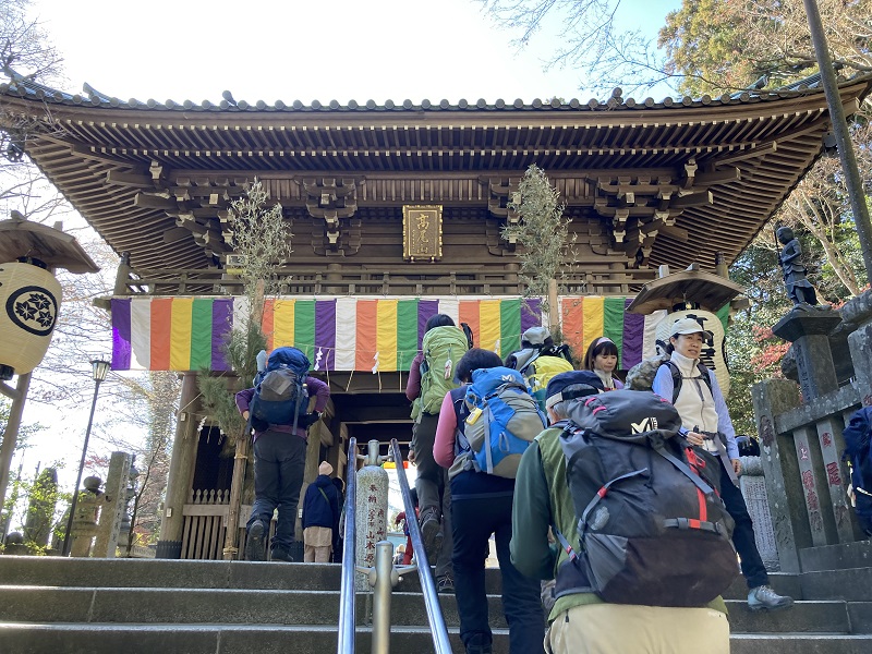 鶴巻温泉駅10:00集合。Bコースの人たちも集まり賑やかになる。早めに全員が揃いBコースより一足先に出発。駅前からナンキンハゼの並木道を歩き、東名高速の下を潜った先のセブンイレブン横から右の道に入る。道なりに緩やかに登って行くと石座神社の石段下に10:20着。ここからは道標もあり10:27野仏の道に入る。吾妻山からの尾根道に合流するまで石仏が数ヵ所安置されている緩やかな道である。10:50尾根道に出た所で小休止。時間に余裕があるのでノンビリ歩く。善波峠で大山への道を分け、めんようの里分岐11:40着。最後の登りを頑張り弘法堂の建つ弘法山に11:58着。大きなイチョウの木があり銀杏が沢山落ちていた。黄葉もまだ残っていて美しい。グループ写真を撮ったあと各々が景色を楽しんでいるとAコースが到着。12:10入れ替わりに我々は集合場所の馬場道に下る。座れる場所を探しAとCコースの到着を待ち昼休憩。13:15権現山に向かい展望台から360度の眺望を楽しむ。下りはBコースから3名が加わり9名で13:40下山開始。急な道を慎重に下って13:50車道に出て名水はだの富士見の湯への道を下る。15分ほどで車道に下り、クリーンセンターと富士見の湯の前を通り14:12国道を横切り秦野駅へ向かう。金目川を渡り地図とスマホの位置情報を確認しながら狭い路地を抜け秦野駅14:45着。駅で解散し希望者6名で駅前の餃子店で反省会をして帰京する。